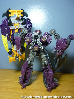 Another nice touch that I like - which others might not appreciate - is that Master Disaster is semi-translucent. This semi-translucence is particularly obvious around the arms and legs. It looks like he's fading OR! Master Disaster is a Hologram - which is sooo in line with what both Autobots and Decepticons have been using so as to not look weird in the past three films. DOTM Drag Strip also has a pair of clip-on blades and you can just imagine how deadly combining the speed of an F1 race car with a sharp object would be.